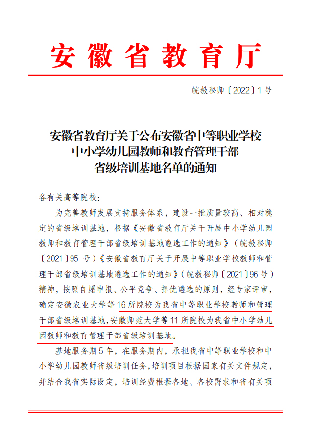 2021年12月,安徽省教育厅开展省级培训基地遴选工作,采取自愿申报的方式。学校组织相关二级学院梳理培训业绩、展示培训优势、规划培训目标,以高质量的申报书和支撑材料进行了申报。省教育厅秉持公平竞争、择优遴选的原则进行了专家评审。