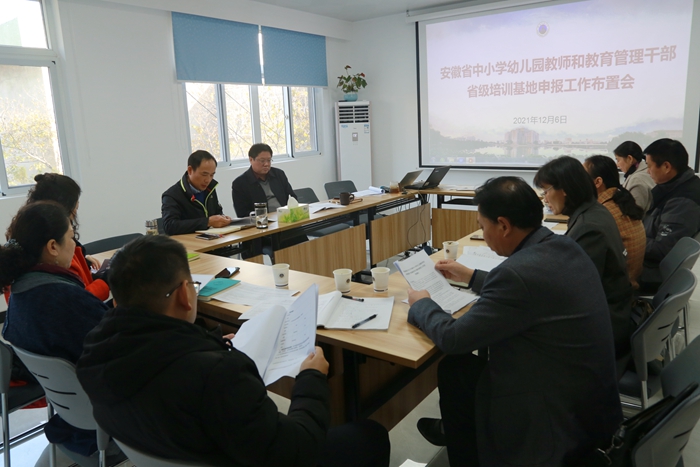 会上,贾会明对安徽省教育厅关于省中小学幼儿园教师和教育管理干部省级培训基地遴选工作的目标任务、基地类别、遴选范围、遴选条件、申报要求等进行了解读,介绍了安徽省教育厅遴选培训基地的背景,说明了学校组织专家组研究讨论后选择申报其中5个基地,并对部分基地学科领域选择的标准进行了解释。培训部主任朱升学说解读了申报书各部分内容的填写规范和要求,杨国丽对需要提供的附件证明材料进行了说明。