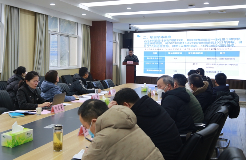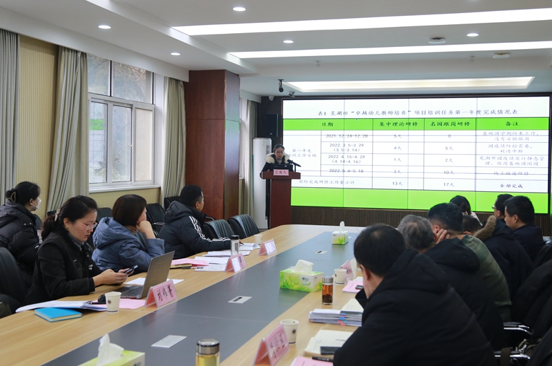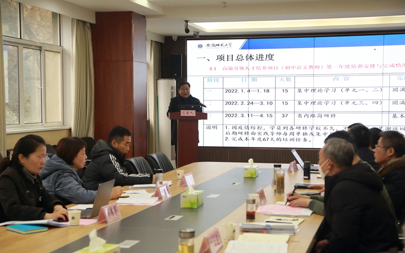 在上午举行的汇报会上,郑文年在主持时说明了视导调研的目的和流程,芜湖市教育局领导和无为市、湾沚区师训部门领导了汇报了项目管理工作,学校承办高端引领人才项目(初中语文)、高端引领人才项目(小学语文)、芜湖市卓越教师培养项目(中小学语文)、芜湖市卓越教师培养项目(中小学英语)、芜湖市卓越教师培养项目(幼儿园)的首席专家夏家顺、吴宗酉、吴玲用PPT的方式,从项目总体进度、项目执行情况、项目培训成效、存在问题及下一步打算等方面,全面汇报了2021年和2022年项目执行递进式、一体化培训情况,包括计划任务的完成情况、双导师设置和指导、集中理论研修、省内外跟岗实践、落实《安徽省“国培计划”项目成果评价办法》、项目学员产出成果和获奖情况等,各项目还汇报了项目实施的特色亮点,并提出了项目实施中存在的问题,报告了2023年项目实施计划和成果推进措施。