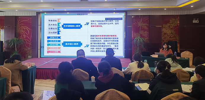 2月28日上午,成都市高新区教育发展中心的高级教师赖雪梅给学员带来了“新课标下的美术单元教学与美术创作”——以艺术家型教师培养学生“像艺术家一样思考”的经验分享。赖老师以自身的书画艺术学习历程告诉大家:“作为老师不能把大学所学的知识教十年、二十年,要不断学习,不断提升自己”。