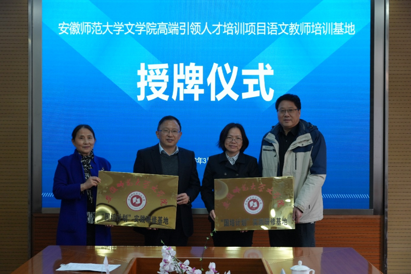 陈爱兰与程庆、姚凤签署了合作协议,并与贾会明一同为安徽师范大学文学院“国培计划”项目实践研修基地揭牌。