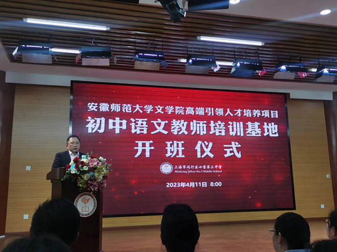 4月11日上午,由文学院承办的安徽省“国培计划”(2022)高端引领人才项目初中语文教师班名校跟岗研修开班仪式在上海市闵行区七宝三中举行。七宝三中校长程庆、副校长赵晓群,培训班班主任李震出席仪式。仪式由七宝三中办公室主任金若薇主持。