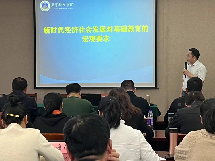 开班仪式后,教育科学学院副教授徐赟为校园长们带来了培训第一课,讲授《新时代经济社会发展对基础教育的宏观要求》。他从新时代的经济社会发展和新时代对基础教育的宏观要求两方面进行分享,用大量的数据和图表阐述新时代经济的表征,以及新时代要求教育在培养创新型人才、全面发展的人才等方面的现状和改进措施,引发了学员对教育问题的深度思考。