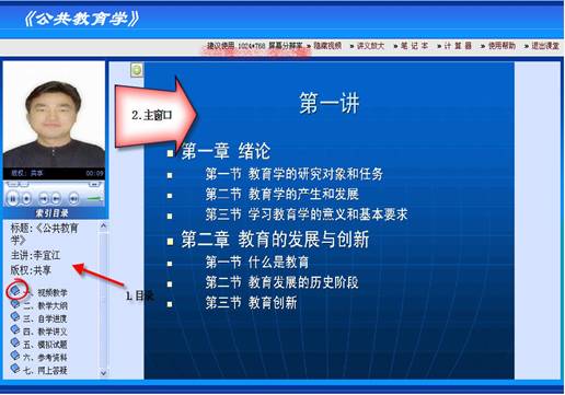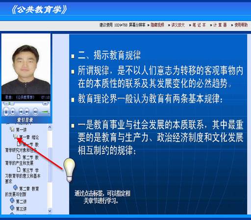 ,学员可以进入相关的学习内容。例如:一、视频教学,即开始进入视频教学内容。学生可以通过点击不同的章节自由选择学习内容。