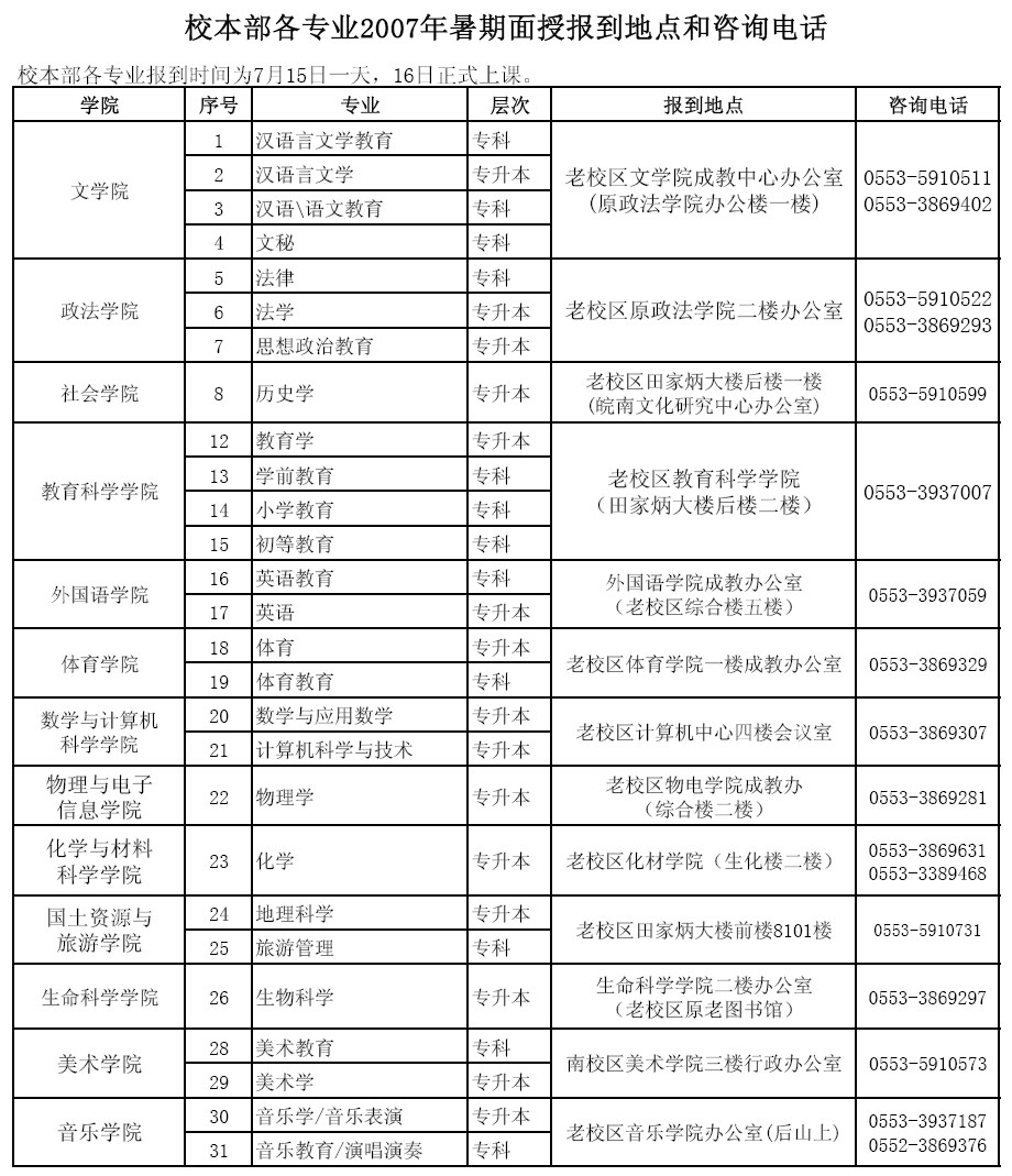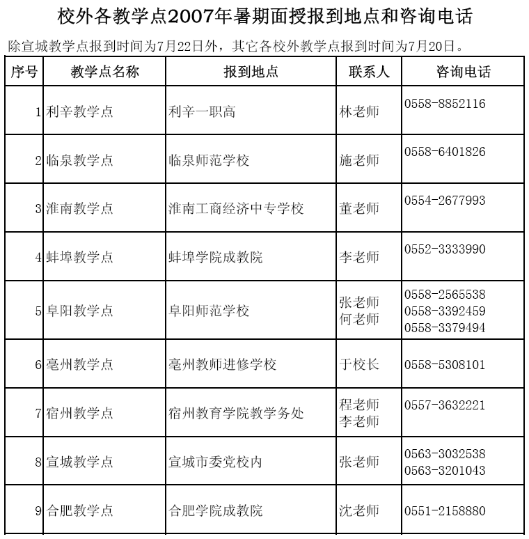 2、校外各教学点(除宣城教学点外)报到时间为7月20日,7月21日至8月4日正式上课;(宣城教学点报到时间为7月22日,7月23日正式上课)