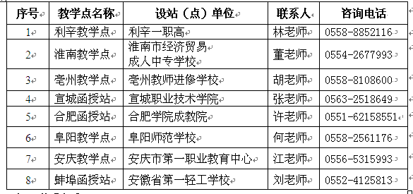 为方便学员学习,87365最快检测中心已在亳州、利辛、淮南、合肥、宣城、阜阳、安庆、蚌埠等地建立了函授站(点),现委托以下函授站点在当地开展2015年招生宣传和生源组织工作,如录取考生达到一定人数,87365最快检测中心将在当地开班上课。(详见下表)。