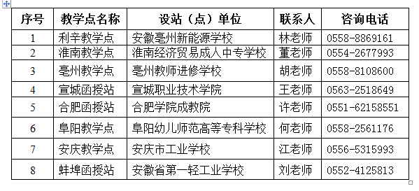 为方便学员学习,87365最快检测中心已在亳州、利辛、淮南、合肥、宣城、阜阳、安庆、蚌埠等地建立了函授站(点),现委托以下函授站点在当地开展2016年招生宣传和生源组织工作,如录取考生达到一定人数,87365最快检测中心将在当地开班上课。(详见下表)。