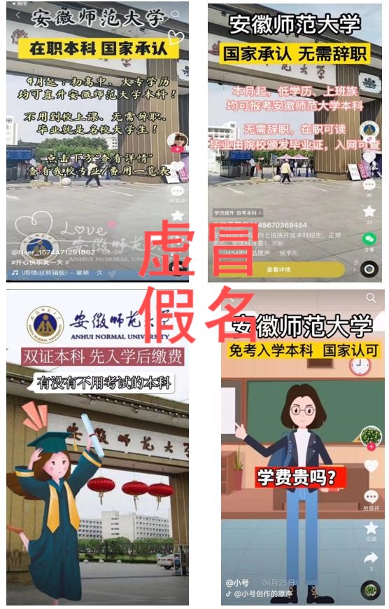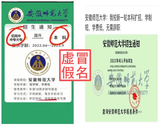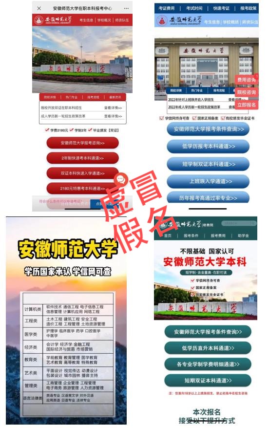 近期,个别机构盗用“安徽师范大学”名称以“安徽师范大学成人学历报考中心”“安徽师范大学学历提升中心”“安徽师范大学成人专升本中心-学历报考”等名义发布虚假广告,以及用机构和个人名义在微博、朋友圈、抖音、快手、今日头条等网络平台上发布“安徽师范大学面向低学历上班族开放本科免费直通车”等虚假信息。为维护学校办学声誉,保障广大考生合法权益,安徽师范大学现就高等学历继续教育、高等教育自学考试的招生宣传和助学等事宜发布郑重声明: