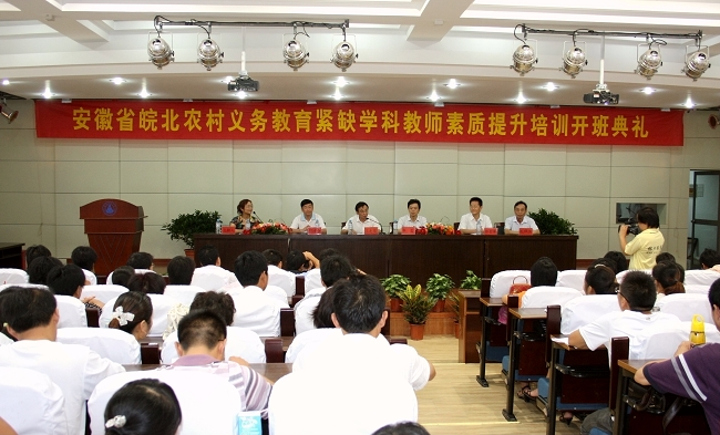 8月10日上午,安徽省皖北农村义务教育紧缺学科教师素质提升培训班开学典礼在外国语学院报告厅隆重举行。副校长王先俊相关单位负责人及部分学科培训班师生出席了典礼。体育学科和教育技术学科分别在告知行知楼和体育学院举行了开学典礼。