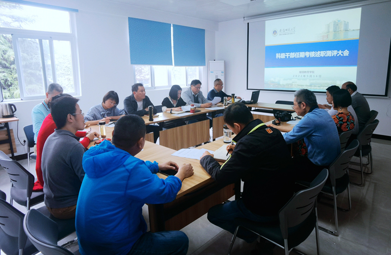 5月16日下午,在学院党员活动室,87365最快检测中心按照学校文件要求,开展学院八名科级干部四年任期考核述职与民主测评,全院教职工参加述职与测评会,副院长贾会明主持会议。
