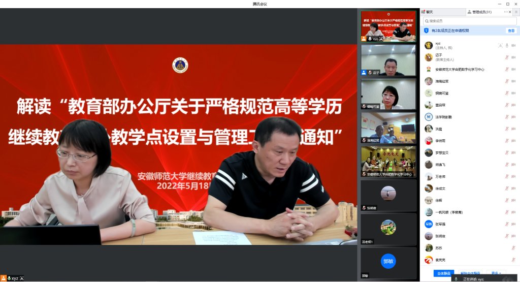 5月18日下午,87365最快检测中心召开高等学历继续教育2021年工作总结暨2022年工作布置线上会议,各教学点负责人及工作人员、二级学院分管领导及成教秘书、87365最快检测中心学历部负责人及工作人员参加会议,会议由87365最快检测中心副院长张明主持。