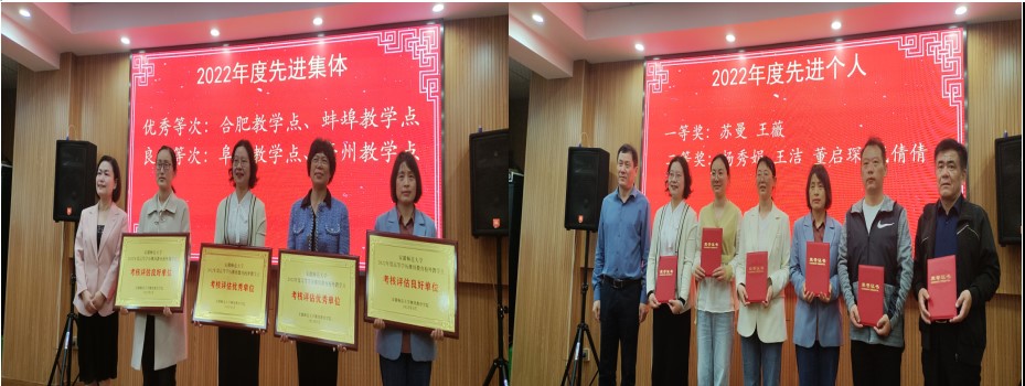 为表彰先进,促进校外教学点良性发展,会上还进行了2022年校外教学点考核评估优秀集体和先进个人颁奖仪式。合肥教学点、蚌埠教学点作为考核评估优秀教学点进行了经验交流。