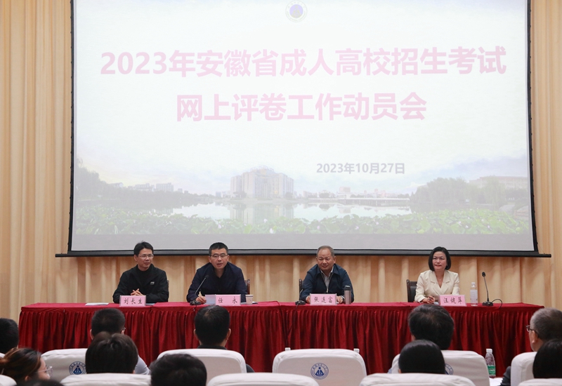 张连富代表安徽省教育招生考试院感谢学校连续17年承担成人高考评卷任务,并在工作中不断探索和改革,完善评卷管理工作。他指出,成人高考是国家教育考试的重要组成部分,在过去的三年疫情中,大家在招生和评卷工作中共同应对艰难险阻,攻坚克难,坚守人民至上,有效应对了各种超预期的因素的冲击,兜住了安全的底线,为教育改革发展和社会稳定做出了积极贡献。今年是三年疫情后的首次成人高考,国家把防范手机等高科技作弊作为保障考试安全的重要举措,建立了五位一体的立体防范,并对评卷环节提出了明确的保密要求。他强调,必须深刻认识成人高考面临的新形势,强化责任担当,科学规范完成本次网上评卷任务,要提高责任意识,确保制度落实到位。强化学习培训,严格制度执行;提高安全意识,确保信息安全保密。制订保密细则,加强日常监管,加大检查力度,严守工作纪律;提高质量意识,确保评卷的公平。坚持标准,强化复核检查,评卷始终如一。他希望大家齐心努力,真抓实干,安全、平稳、高质量的完成2023年成人高考评卷工作,为办好人民满意的教育强省做出贡献。