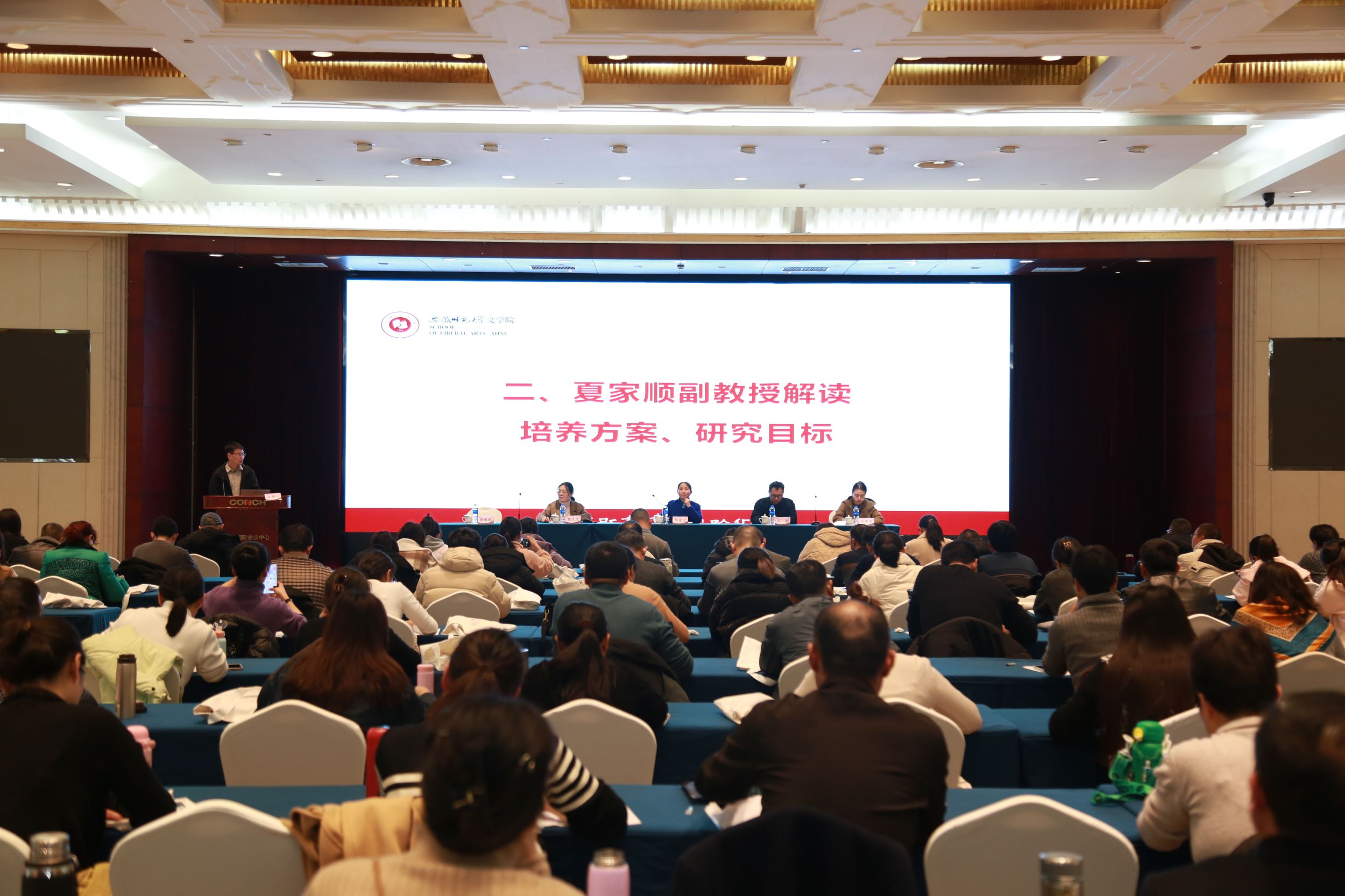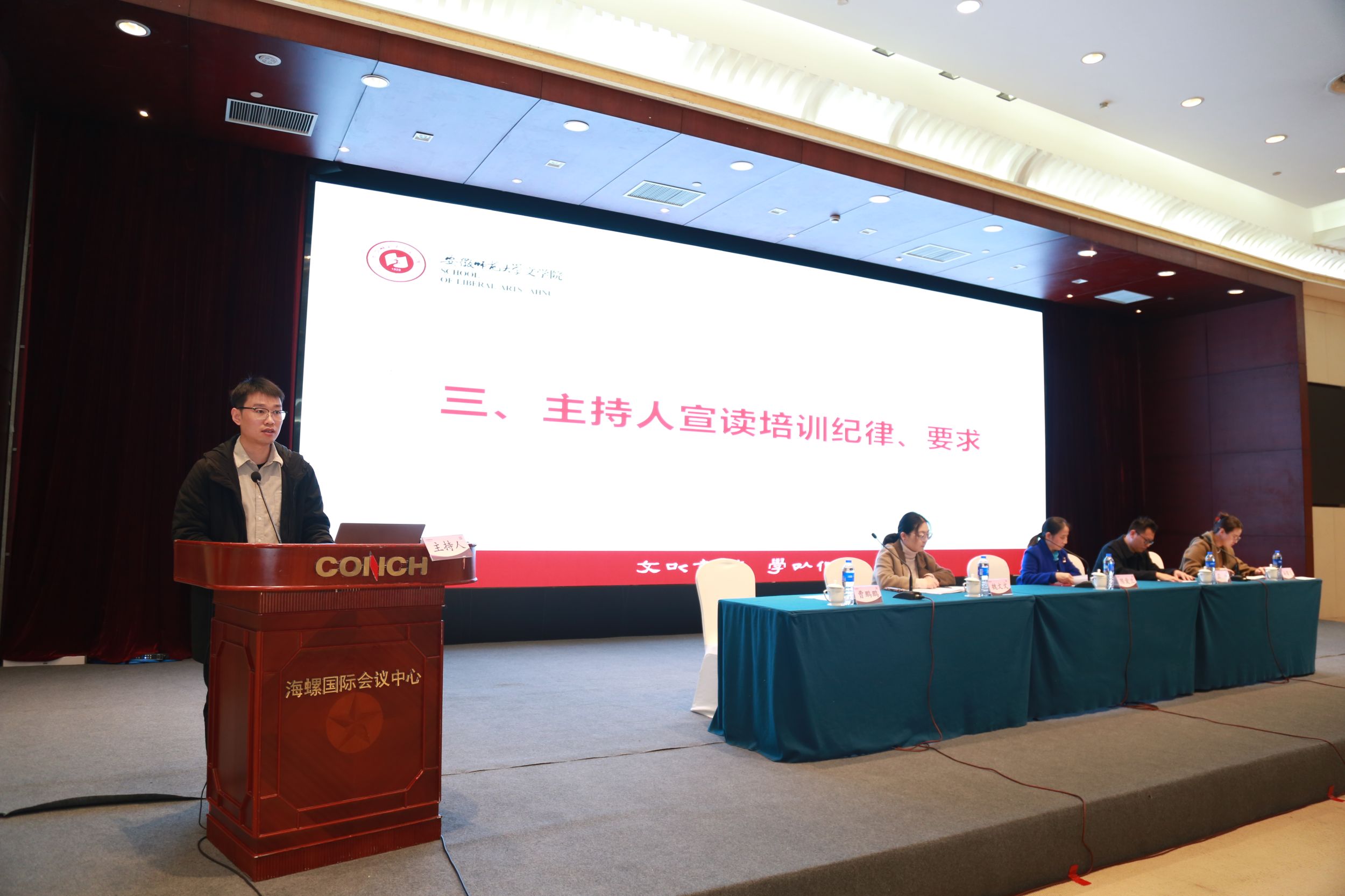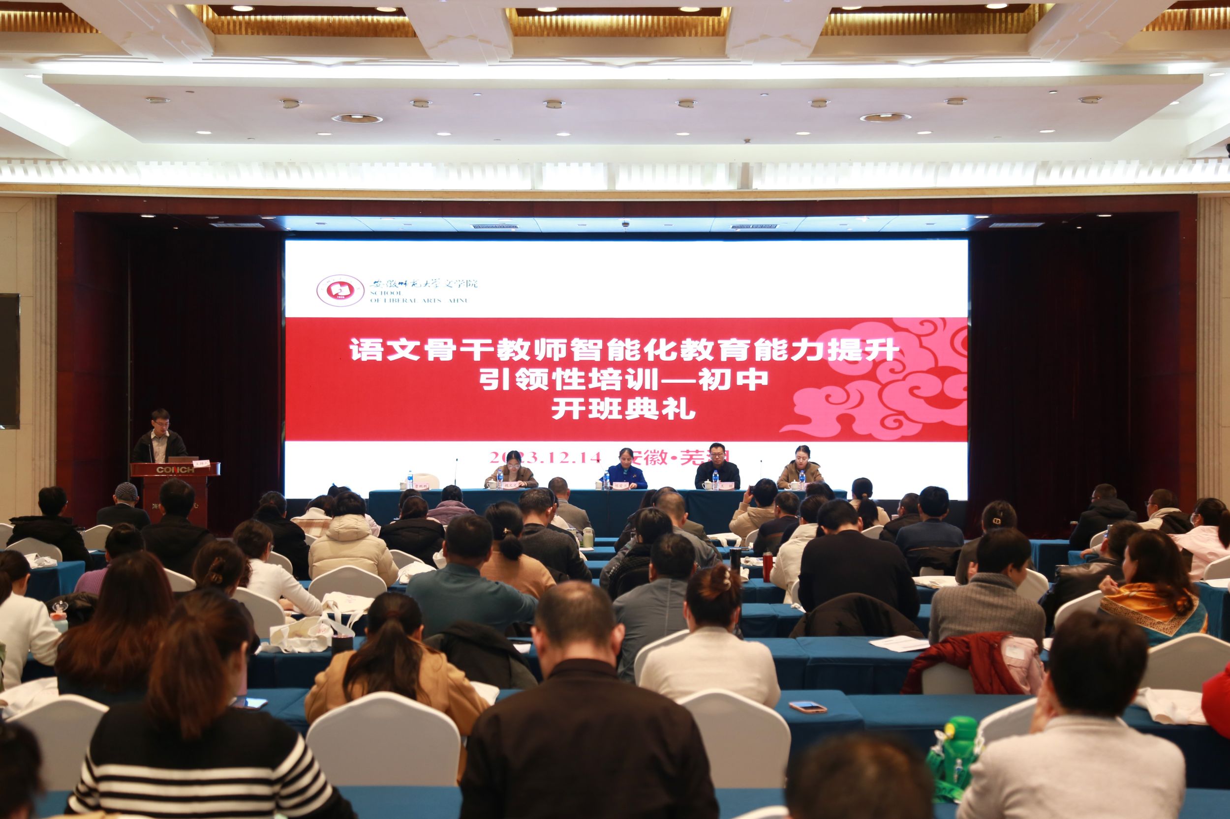 12月14日上午,由安徽师范大学承办的2023年安徽省“国培计划”——语文骨干教师智能化教育能力提升引领性培训-初中项目隆重开班。文学院副院长陈爱兰,项目首席专家夏家顺副教授,培训班班主任曹鹏鹏、魏文文、王桢、孙霁雯以及来自全省各地的近200名初中语文骨干教师参加开班典礼。典礼由培训班班主任曹鹏鹏主持。