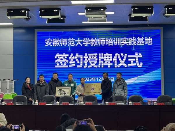 为进一步提升教师培训项目学员实践教学能力,适应新时代教师发展的要求,12月15日上午,文学院与芜湖市南湖学校合作共建“国培计划”实践研修基地签约授牌仪式在南湖学校隆重举行。安徽师范大学文学院副院长陈爱兰,南湖学校党委书记汪锋,副校长宗寿舞、张胜,“2023年安徽省‘国培计划’项目——初中语文骨干教师智能化教育能力提升引领性培训班”班主任曹鹏鹏、魏文文、王桢以及来自省内各地的近200名学员参加了签约授牌仪式。