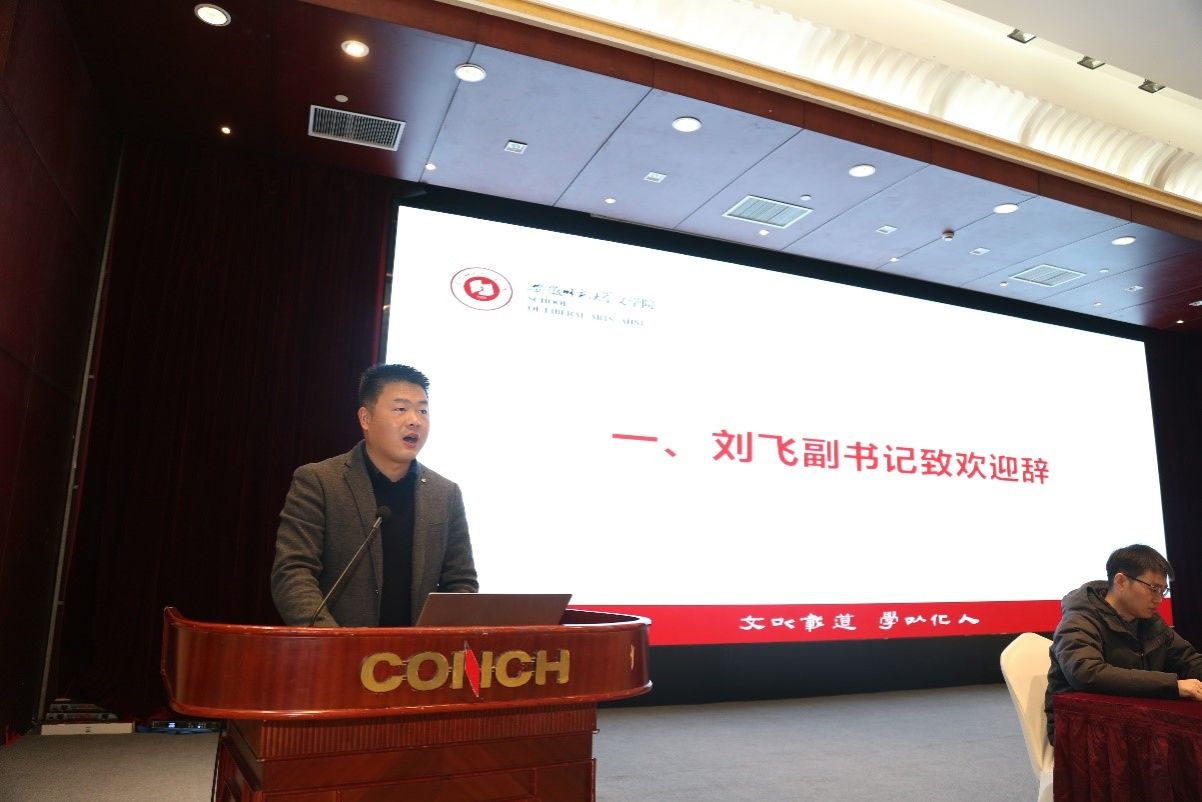 在开班仪式上,刘飞副书记对各位学员的到来表示真诚的欢迎。他向参训学员介绍了安徽师范大学的悠久历史,以及文学院的基本概况。刘飞副书记表示,在天气恶劣的情况下,学员克服了交通、工作、家庭等诸多因素,到达芜湖参加本次培训,希望参训学员珍惜学习机会,遵守培训有关规定,积极参与培训的各项活动,切实提升自身的智能化教育能力。