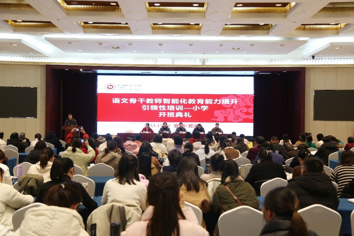 12月19日上午,学校承办的2023年安徽省“国培计划”——语文骨干教师智能化教育能力提升引领性培训-小学项目在芜湖隆重开班。文学院党委副书记刘飞,项目首席专家夏家顺副教授,培训班班主任曹鹏鹏、魏文文、王桢、孙霁雯以及来自全省各地的近250名小学语文骨干教师参加开班典礼。典礼由曹鹏鹏主持。