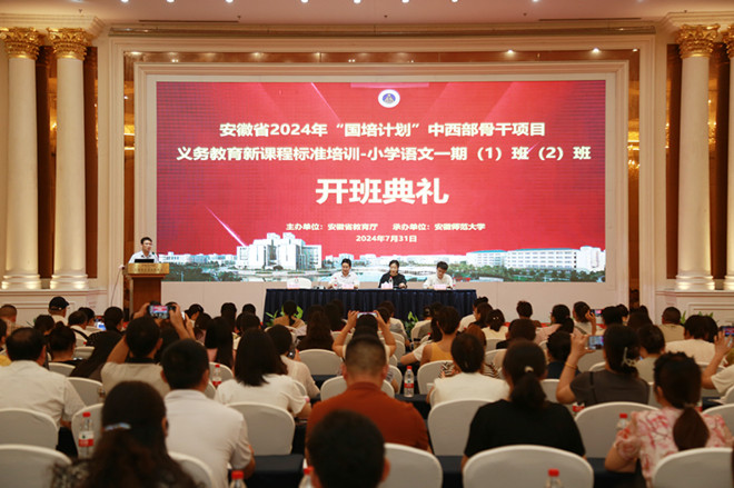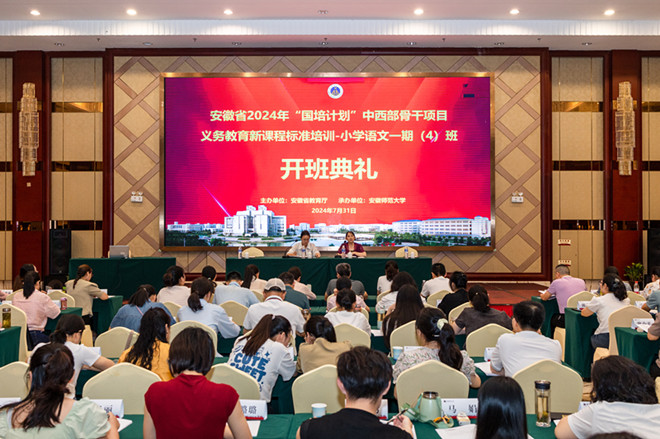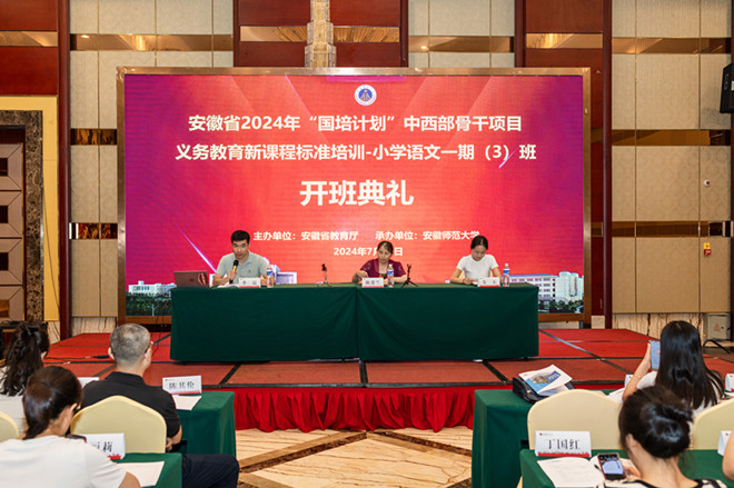 7月31日下午,学校承办的安徽省2024年“国培计划”中西部骨干项目——义务教育新课程标准小学语文一期培训班开班。文学院副院长陈爱兰、李伟,项目首席专家张晋,培训班班主任曹鹏鹏、孙霁雯、阮熹晟、李震,以及来自安庆、蚌埠、滁州、合肥、六安等五个地市的近600名小学语文骨干教师参加了开班典礼。典礼在三个会场同步举行,由各班班主任主持。