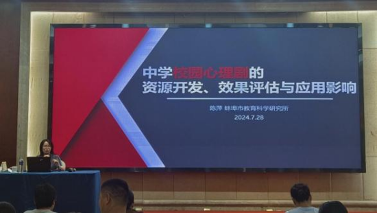 7月28日下午,蚌埠市教育科学研究所学科带头人、高级教师陈萍老师分享主题为《中学校园心理剧的资源开发、效果评估与应用影响》。陈萍老师从分析优秀案例出发,展开了对心理自助的新视角、校园心理剧类型、校园心理剧创作、校园心理剧教育教学资源、校园心理剧效果评估、校园心理剧应用影响六个方面的阐述。理论与案例相结合,让老师们认识到校园心理剧在中学生心理健康教育中的重要性和无限潜力。教师要多搭建平台,助力孩子们身心健康地成长。