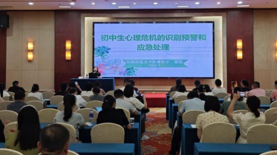 7 月 27 日上午,安徽师范大学附属中学德育副主任、高级教师谢莉为学员们带来主题为《初中生心理危机的识别、预警和应急处 理》的讲座。谢莉老师从初中生心理危机方面出发,用典型案例及身边事件为依 托,介绍了初中生心理危机的现状、产生原因、具体表现,以及如何预防、识别、 应对学生心理危机。谢老师在培训中强调:学校及老师应该未雨绸缪,危机干预 的重点应该从危机后的应急处理转向危机前的早期预防。最后,谢老师希望各位老师能够尊重孩子,明确边界感,为所当为。
