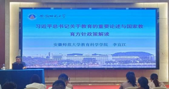 7月28日上午,安徽师范大学教育科学学院院长李宜江教授作《习近平总书记关于教育的重要论述与国家教育方针政策解读》的讲座。讲座伊始,李宜江院长以“国家教育方针究竟是什么”这一问题切入,阐述其与心理健康教育的内在联系。李院长从三个方面详细阐述:一是习近平总书记关于教育重要论述的科学内涵;二是新时代我国教育方针政策的内涵;三是习近平总书记关于教育重要论述的贯彻落实。让我们对习近平总书记关于教育的重要论述与国家教育方针政策有了更全面、更深入的理解,为教育工作提供了理论基础和行动指南。