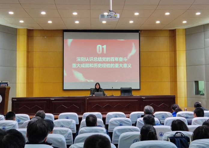 会议邀请团中央青年讲师团讲师、安徽省委讲师团专家库青年宣讲名师、马克思主义学院副教授沈燕培作党的十九届六中全会精神学习辅导报告。报告从深刻认识总结党的百年奋斗重大成就和历史经验的重大意义、深刻认识历史决议的主要内容和重大创新、深刻认识以史为鉴、开创未来的重要要求三个方面,围绕“两个确立”“十个坚持”“十个明确”等重点内容,全面系统地阐述了党的十九届六中全会的重大历史意义、核心要义与精神实质。