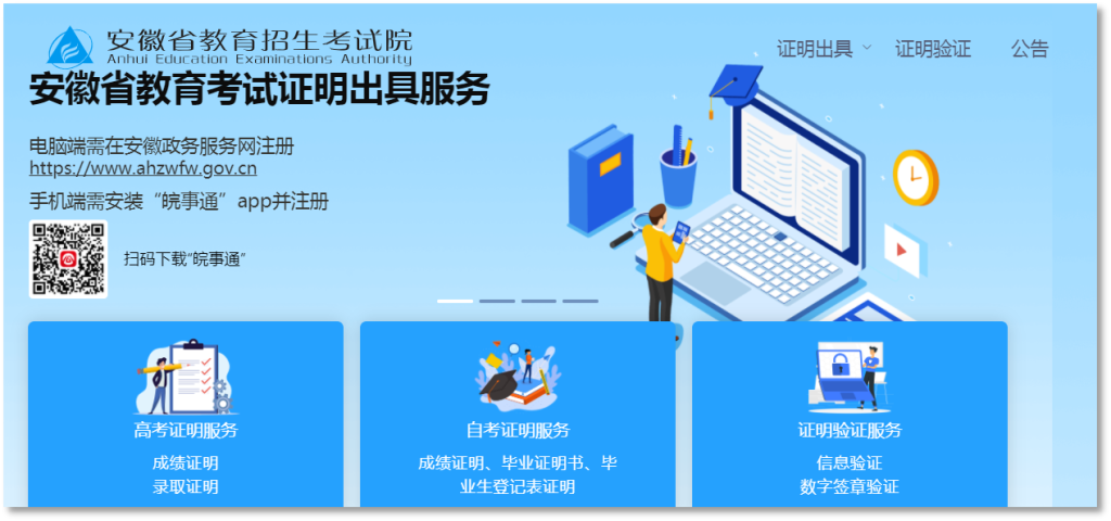 接安徽省教育招生考试院通知,我省自考证明服务网站地址已更新为(https://zm.ahzsks.cn/),自考生如需要开具成绩证明、毕业证明书、毕业生登记表证明,可访问该地址。