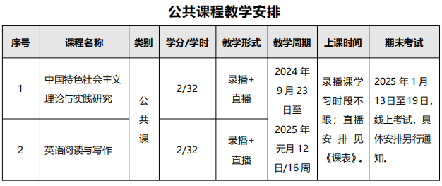 2、公共课程。公共课程教学安排见下方表格。其中录播课由学员自行在学习平台点播学习课程视频,平台记录学习时长;直播课需学员实时同步在线参与任课教师的课堂教学,完成课堂任务,平台根据在线情况考勤。